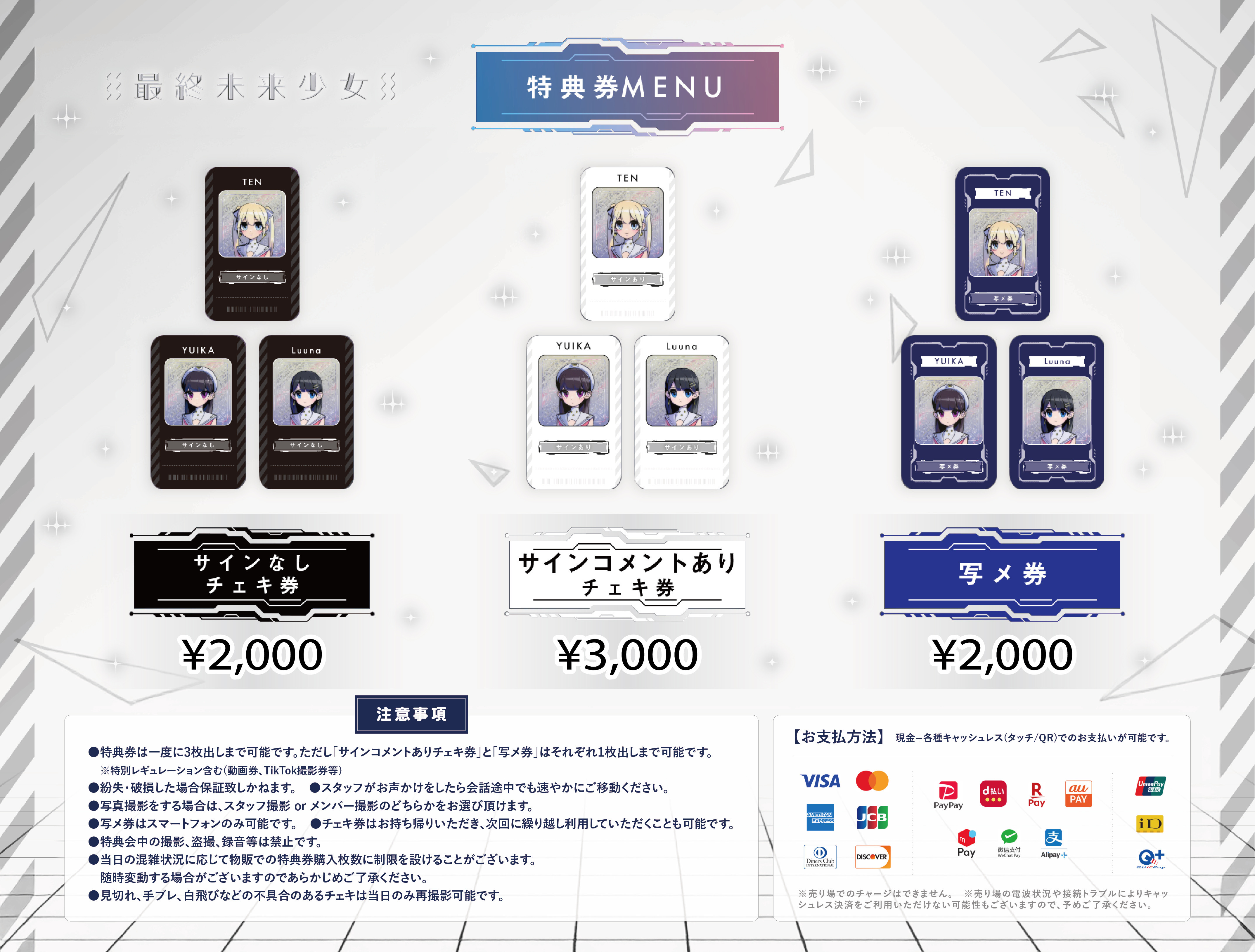 ・基本は最終未来少女 特典会レギュレーションに準じて実施予定ですが、混雑緩和のために1撮影での同時出し枚数に制限を設定させていただいたり、状況によりレギュレーションは随時変更の可能性がございます。