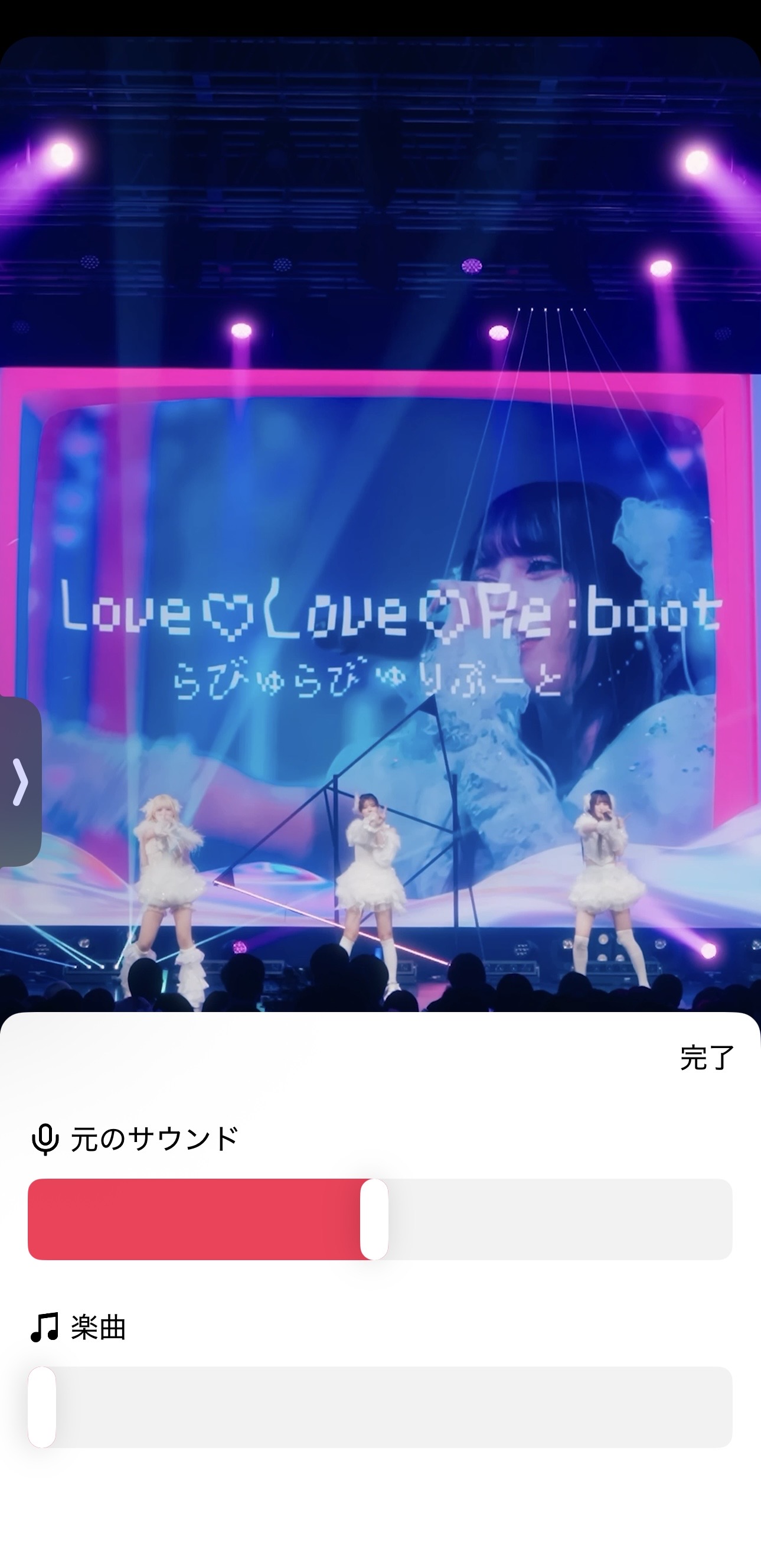 ・「元のサウンド」(元の動画の音)を画像のようにゲージの真ん中=100%に設定