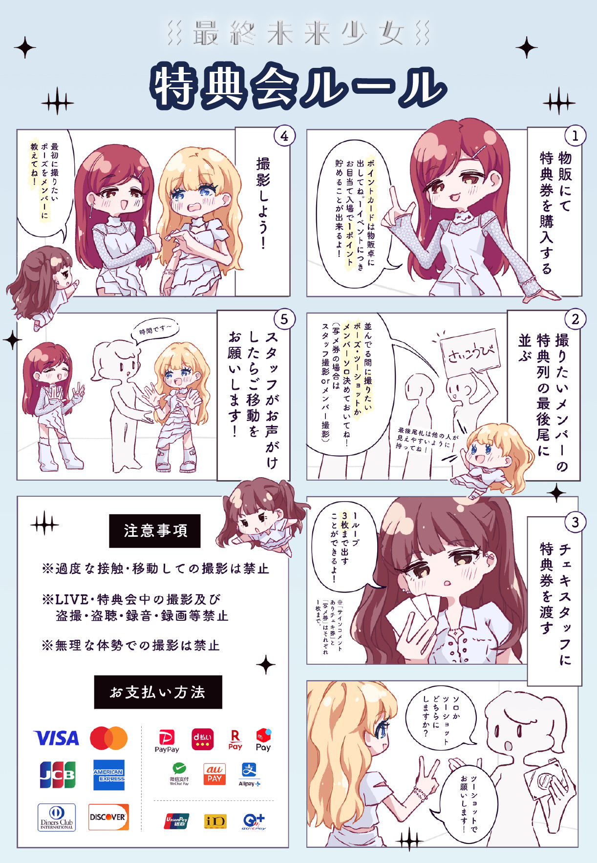 最終未来少女の特典会ではご購入いただいた特典券をご使用いただくことで、チェキの撮影やメンバーとのトークが可能です。