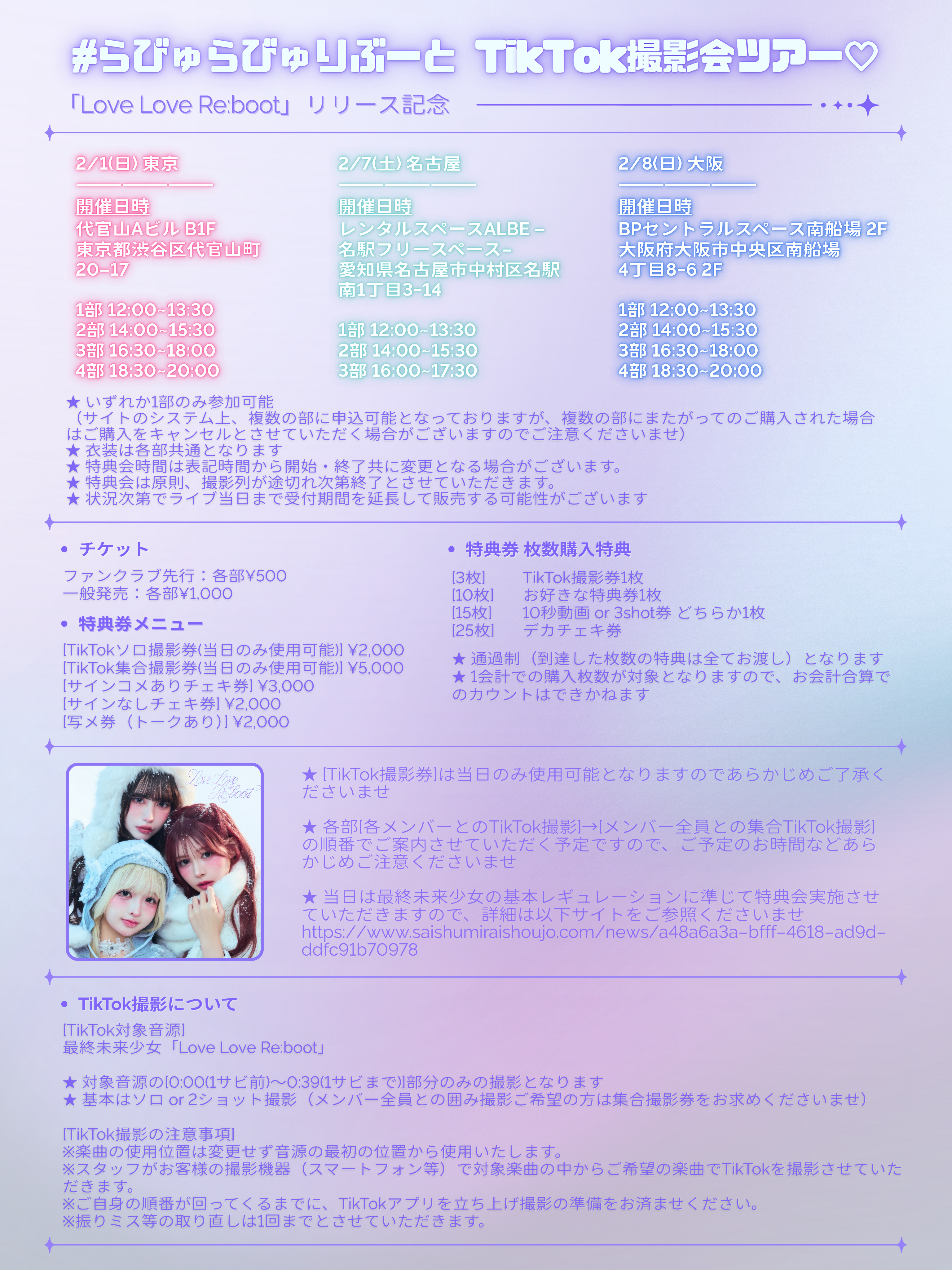 ★ 各部[各メンバーとのTikTok撮影]→[メンバー全員との集合TikTok撮影]の順番でご案内させていただく予定ですので、ご予定のお時間などあらかじめご注意くださいませ。