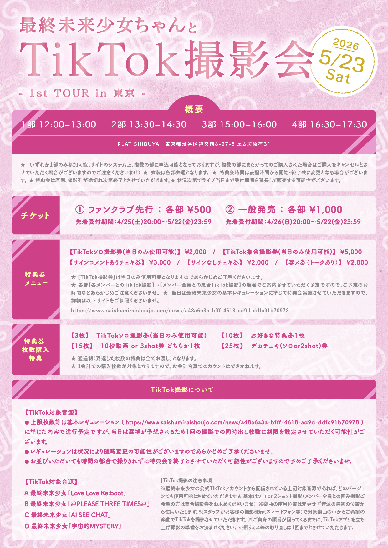 ※最終未来少女の公式TikTokアカウントから配信されている上記対象音源であれば、どのバージョンでも使用可能とさせていただきます★ 基本はソロ or 2ショット撮影(メンバー全員との囲み撮影ご希望の方は集合撮影券をお求めくださいませ)
