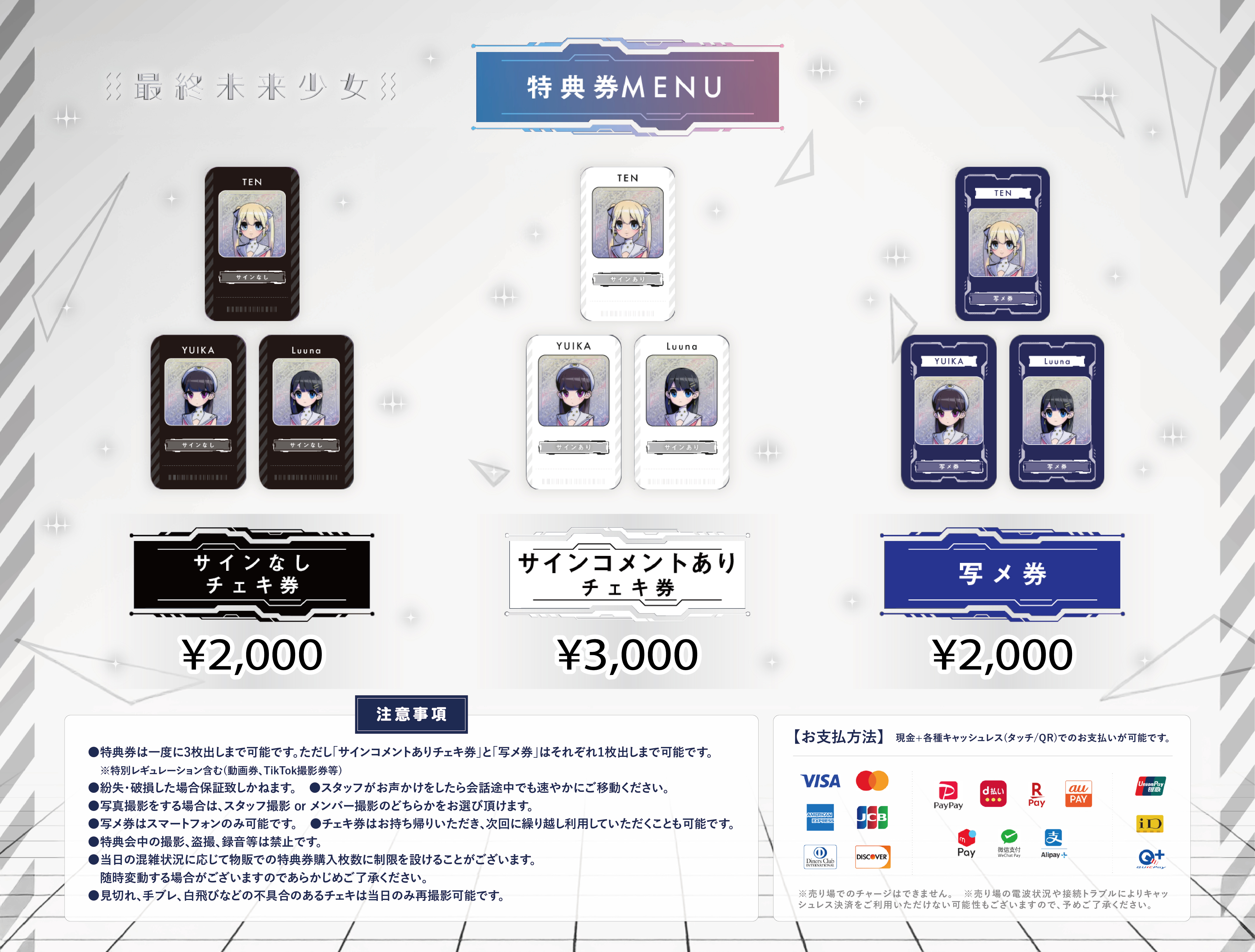 ・特典券の上限枚数等は基本レギュレーション(https://www.saishumiraishoujo.com/news/a48a6a3a-bfff-4618-ad9d-ddfc91b70978)に準じた内容で進行予定ですが、当日は混雑が予想されるため1回の撮影での同時出し枚数に制限を設定させていただく可能性がございます。